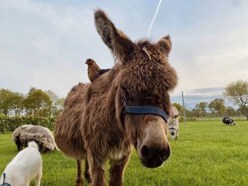 - dieren aaien, eieren zoeken en ezels borstelen bij de boerderij naast het huis