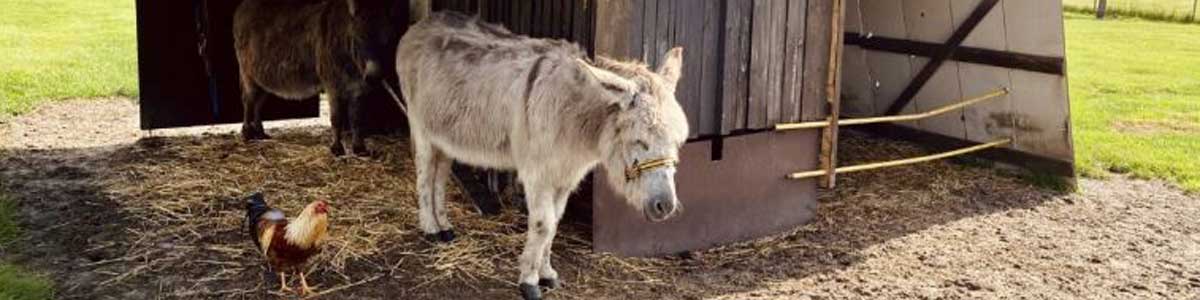 - dieren aaien, eieren zoeken en ezels borstelen bij de boerderij naast het huis